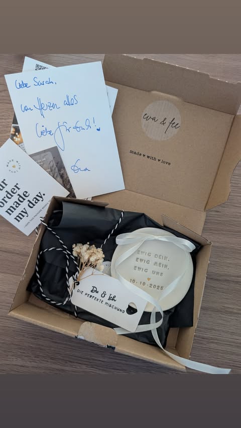 Liebe Eva, ich hab eben das Ringschälchen ausgepackt und mich so gefreut 🥲 Nicht nur, weil die Ringschale wunderschön ist, sondern auch, weil es so liebevoll verpackt war. 🥰 Das Schälchen wird auch nach der Hochzeit ein wunderschönes Erinnerungsstück sein. ❤️ Sarah